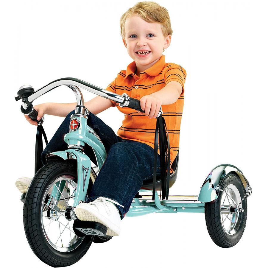 The Roadster Kid's Tricycle is designed with a retro look and a steel trike frame, and its low center of gravity makes it easy to ride and perfect for young riders.